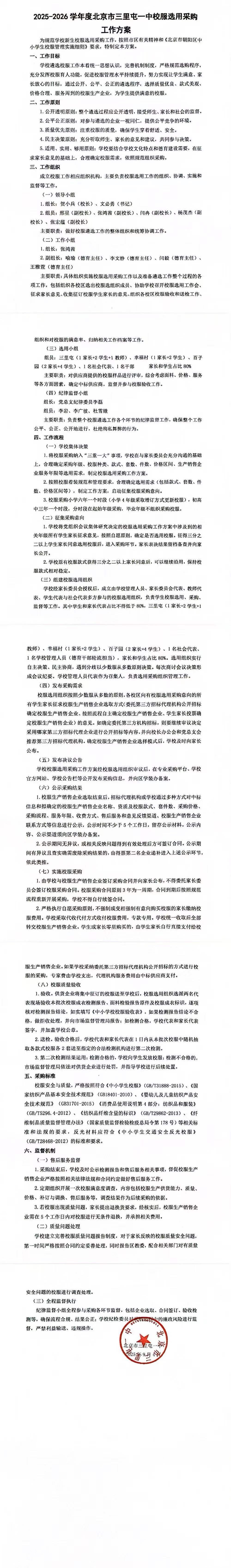2025-2026学年度北京市三里屯一中校服选用采购工作方案